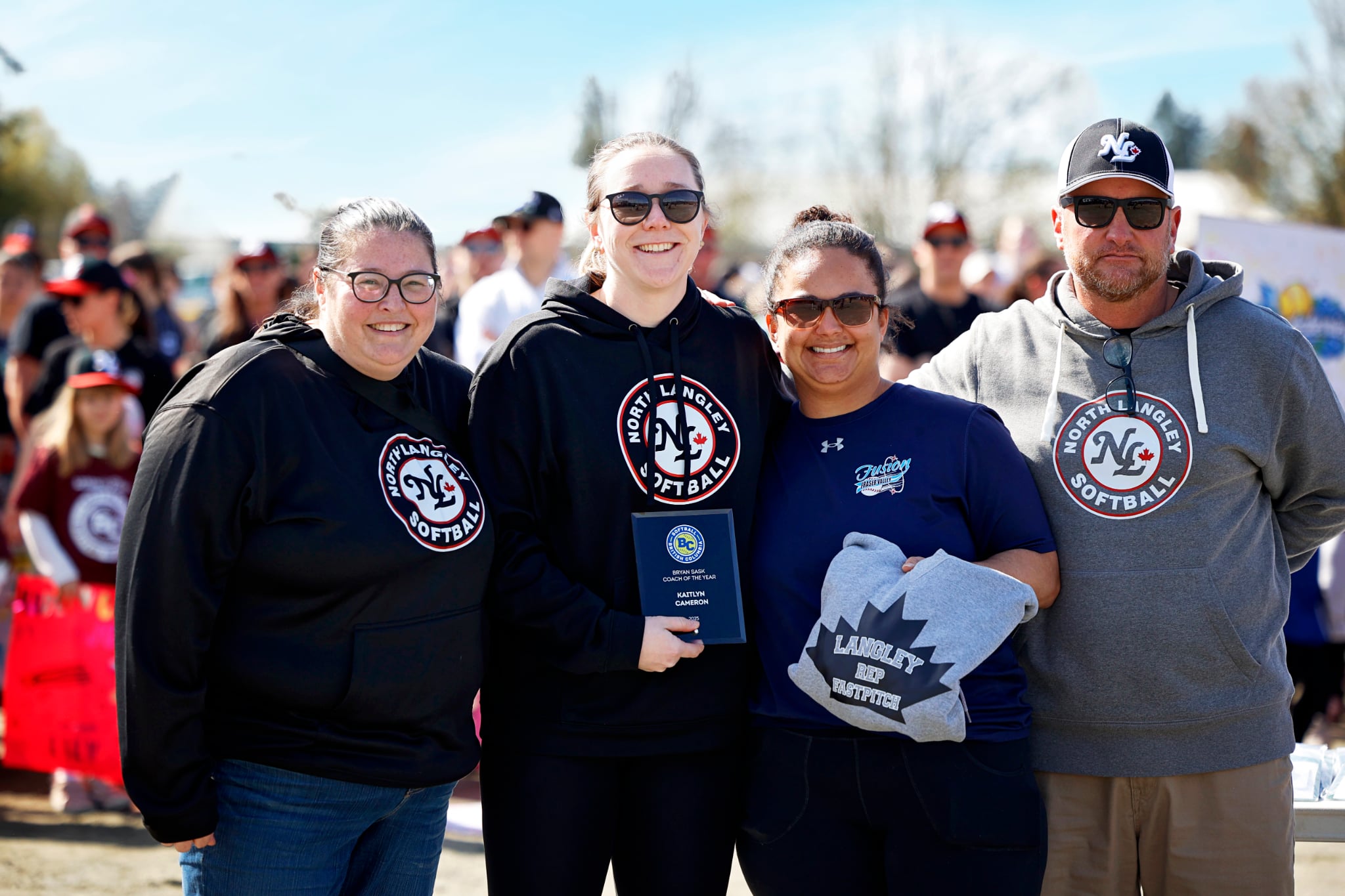 Photo from left to right : Erin Heutink (VP REP North Langlet Softball), Kaitlyn Cameron (Bryan Sask Coach Of The Year), Celine Yarwood (Langley Rep Fastpitch), Trevor Moreno (President North Langley Softball)